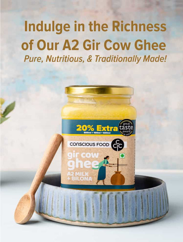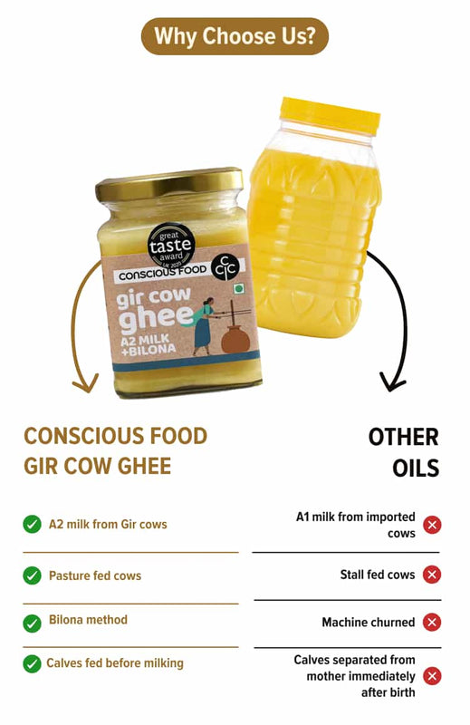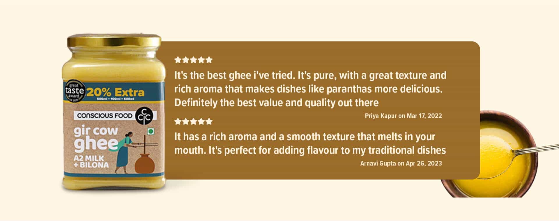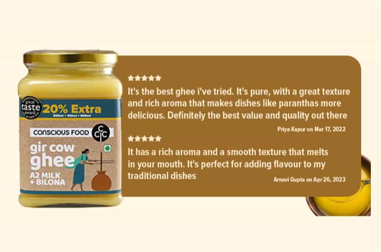 A2 Ghee is made from the ancient Bilona method using A2 milk from the Desi cow. Desi cows give less milk than hybrid or regular cows. Further, the laborious process is costlier and time-consuming as compared to the regular ghee-making process. That is why the A2 ghee is costlier.